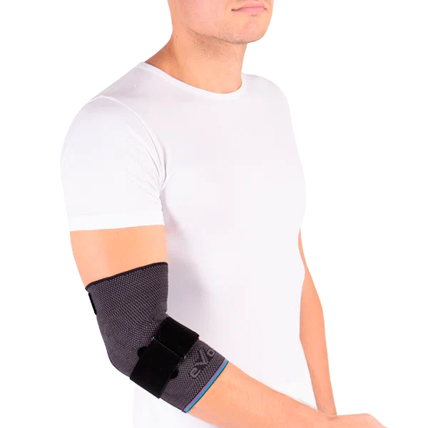 У бандажа есть боковые силиконовые пелоты с вырезами для надмыщелков. Эта конструкция способствует рассасыванию отеков и обеспечивает плотное прилегание бандажа. Съемная дополнительная стяжка регулирует степень фиксации. В месте сгибания сустава специальная высокоэластичная зона с разряженной плотностью.